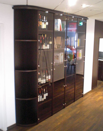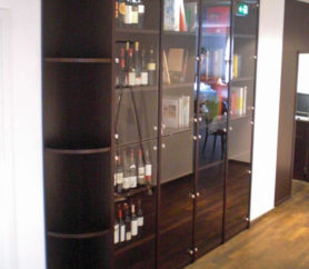 Dieser Vitrinenschrank für ein Großraumbüro wurde wunschgemäß dunkel gebeizt lackiert gefertigt mit innen liegender Beleuchtung und eine abschließbaren Glasfront versehen.